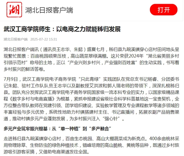 7月9日,武汉工商学院电子商务学院“只此青绿”实践团队在党总支书记杨睿、分团委书记朱懿、驻村工作队队员王志华以及副教授艾洪波和郭人瑞老师的带领下,深深扎根秭归县。团队充分发挥武汉工商学院电子商务学院国家级一流本科专业的实力,以国家级精品课程《数字乡村与电商直播》为根基,紧抓申报建设省级社会科学科普基地这一宝贵契机,全方位整合带队教师在党建引领、团学组织建设、实验教学管理及专业课程教学等诸多领域的丰富经验与多元优势,系统性地助力村镇搭建村主任、书记直播间,拓展农副产品销售渠道,推动村镇多元产业蓬勃发展,为乡村振兴注入“强心针”。