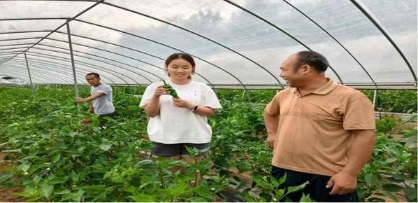 “这个青椒得像这样托着底部轻轻转动,才不会伤了藤蔓。” 在穿心店村的蔬菜大棚里,“只此青绿”实践团队的师生们正跟着农户学习采摘技巧,一场生动的“田间课堂”在此展开。而在不远处的桃园,学生们一边体验采摘,一边用镜头记录硕果累累的丰收景象,这些素材将成为直播带货的“原生广告”。
