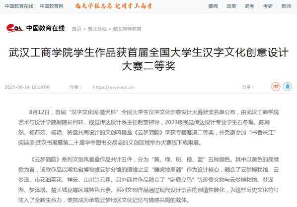 8月12日,首届“汉字文化周·楚天杯”全国大学生汉字文化创意设计大赛获奖名单公布,由武汉工商学院艺术与设计学院副院长何轩、视觉传达设计系主任赵莹指导,2023级视觉传达设计专业学生石冬梅、陈嫣然、杨茜茹、杨艳、骆雪共同设计的文创风景盒《云梦简韵》荣获专题赛道二等奖,并受邀参加“书香长江”阅读周·武汉书展暨第二十届华中图书交易会的文创区域举办大赛线下成果展。