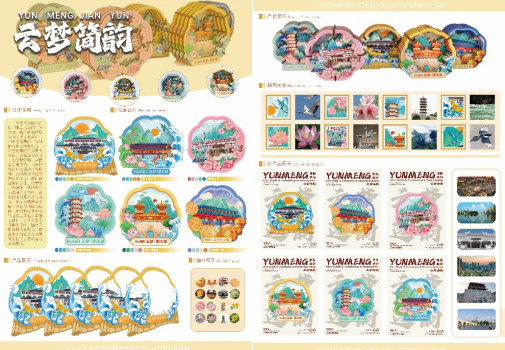 《云梦简韵》系列文创风景盒作品共计五件,分为“黄、绿、粉、橙、蓝”五种颜色。其中以黄色的简牍款为首,该款作品以湖北省博物馆云梦分馆的镇馆之宝“睡虎地秦简”作为设计核心,融合了云梦博物馆、云梦泽、市花油菜花、祥云、山川等元素。另外四件作品融合了“卧鹿立鸟”等珍贵文物与云梦博物馆、梦泽湖、梦泽塔、楚王城及等区域特色元素。系列文创作品通过现代设计语言的创造性转化,为这些历史文化符号注入了全新生命力,使其成为承载云梦地区文化记忆与情感共鸣的载体。