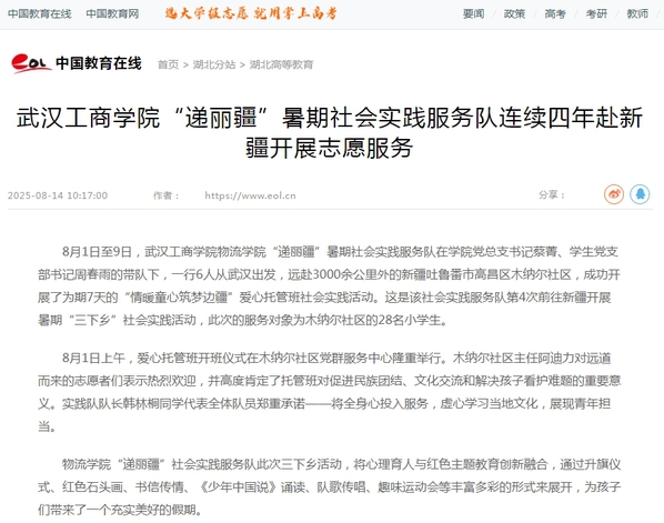 “武汉工商学院爱心托管班活动不仅解决了暑期孩子看护难题,更重要的是为孩子们带来了知识与欢乐,促进了全面发展,体现了社会各界对青少年成长的关心,是推动教育公平、助力乡村振兴的生动实践。”社区妇女主任米合热古丽、团支部书记祖力皮亚?斯马义衷心感谢实践队员们的辛勤付出,称赞他们“用青春和热情为孩子们点亮了知识的灯塔”。(通讯员:周春雨 何美靖)