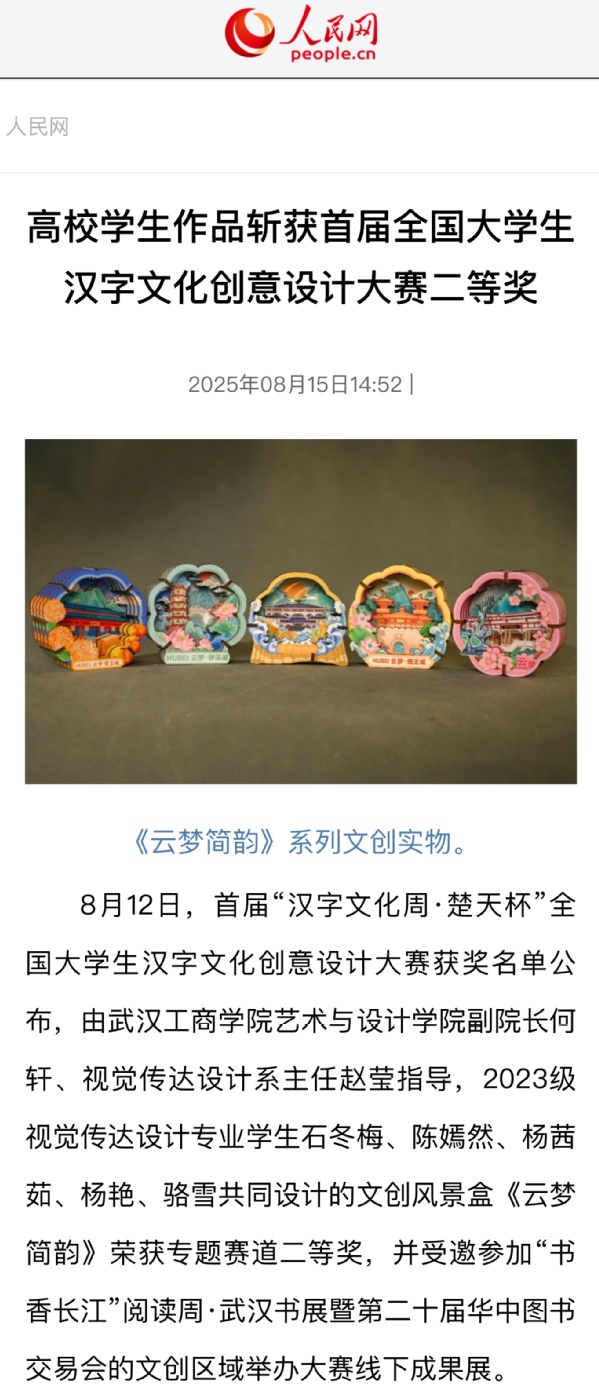 8月12日,首届“汉字文化周·楚天杯”全国大学生汉字文化创意设计大赛获奖名单公布,由武汉工商学院艺术与设计学院副院长何轩、视觉传达设计系主任赵莹指导,2023级视觉传达设计专业学生石冬梅、陈嫣然、杨茜茹、杨艳、骆雪共同设计的文创风景盒《云梦简韵》荣获专题赛道二等奖,并受邀参加“书香长江”阅读周·武汉书展暨第二十届华中图书交易会的文创区域举办大赛线下成果展。