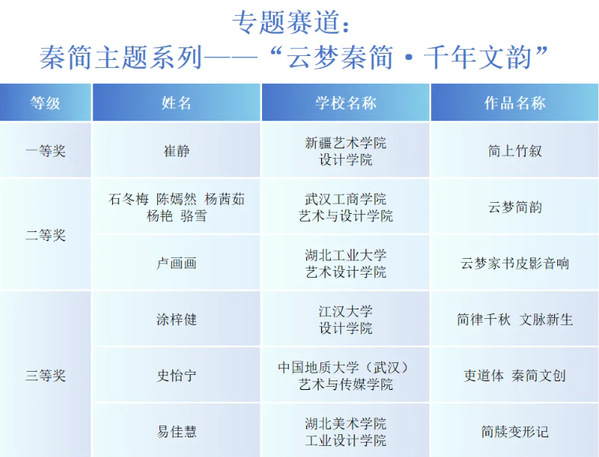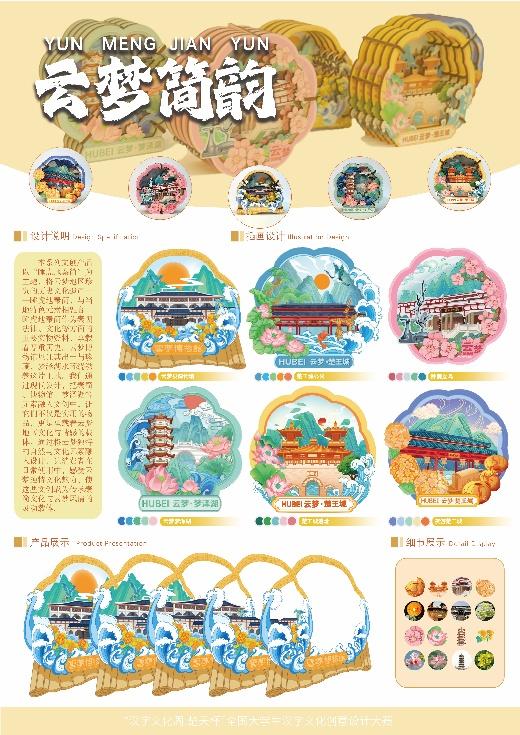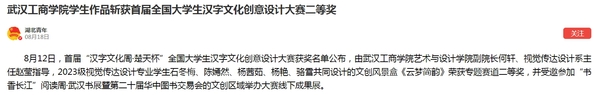 8月12日,首届“汉字文化周·楚天杯”全国大学生汉字文化创意设计大赛获奖名单公布,由武汉工商学院艺术与设计学院副院长何轩、视觉传达设计系主任赵莹指导,2023级视觉传达设计专业学生石冬梅、陈嫣然、杨茜茹、杨艳、骆雪共同设计的文创风景盒《云梦简韵》荣获专题赛道二等奖,并受邀参加“书香长江”阅读周·武汉书展暨第二十届华中图书交易会的文创区域举办大赛线下成果展。