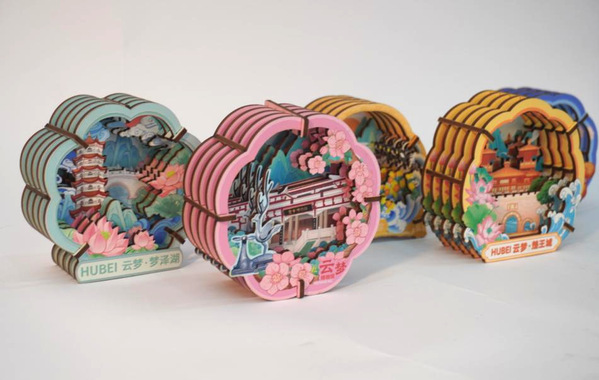 《云梦简韵》系列文创风景盒作品共计五件,分为“黄、绿、粉、橙、蓝”五种颜色。其中以黄色的简牍款为首,该款作品以湖北省博物馆云梦分馆的镇馆之宝“睡虎地秦简”作为设计核心,融合了云梦博物馆、云梦泽、市花油菜花、祥云、山川等元素。另外四件作品融合了“卧鹿立鸟”等珍贵文物与云梦博物馆、梦泽湖、梦泽塔、楚王城及等区域特色元素。系列文创作品通过现代设计语言的创造性转化,为这些历史文化符号注入了全新生命力,使其成为承载云梦地区文化记忆与情感共鸣的载体。