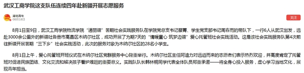 “武汉工商学院爱心托管班活动不仅解决了暑期孩子看护难题,更重要的是为孩子们带来了知识与欢乐,促进了全面发展,体现了社会各界对青少年成长的关心,是推动教育公平、助力乡村振兴的生动实践。”社区妇女主任米合热古丽、团支部书记祖力皮亚•斯马义衷心感谢实践队员们的辛勤付出,称赞他们“用青春和热情为孩子们点亮了知识的灯塔”。(通讯员 周春雨 何美靖 来源:武汉工商学院)