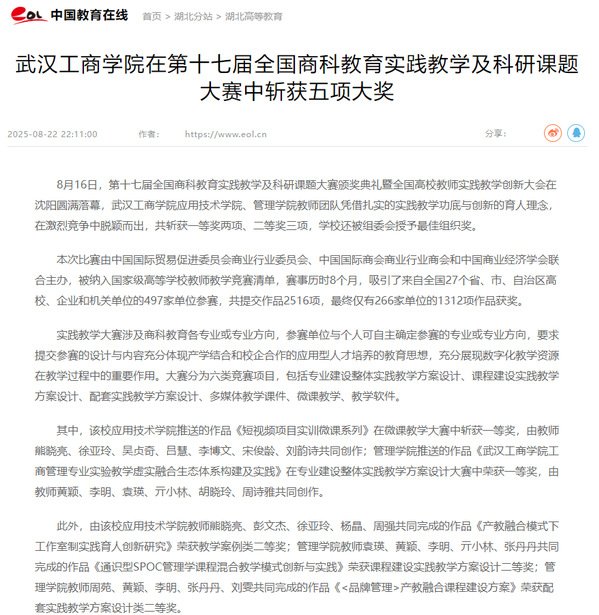 其中,该校应用技术学院推送的作品《短视频项目实训微课系列》在微课教学大赛中斩获一等奖,由教师熊晓亮、徐亚玲、吴贞奇、吕慧、李博文、宋俊龄、刘韵诗共同创作;管理学院推送的作品《武汉工商学院工商管理专业实验教学虚实融合生态体系构建及实践》在专业建设整体实践教学方案设计大赛中荣获一等奖,由教师黄颖、李明、袁瑛、亓小林、胡晓玲、周诗雅共同创作。