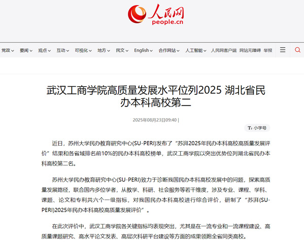 近日,苏州大学民办教育研究中心(SU-PERI)发布了“苏湃2025年民办本科高校高质量发展评价”结果和各省域排名前10%的民办本科高校榜单,武汉工商学院以突出优势位列湖北省民办本科高校第二名。