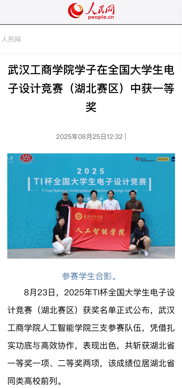 8月23日,2025年TI杯全国大学生电子设计竞赛(湖北赛区)获奖名单正式公布,武汉工商学院人工智能学院三支参赛队伍,凭借扎实功底与高效协作,表现出色,共斩获湖北省一等奖一项、二等奖两项,该成绩位居湖北省同类高校前列。