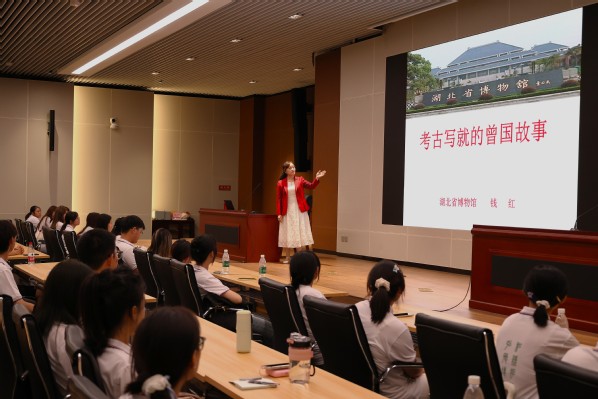 湖北省博物馆社会教育部主任、工会主席、学术委员会委员,湖北省社会科学院硕士研究生导师,中国博物馆协会社教专委会副主任委员、专家库专家,中国博物馆协会志愿者工作委员会副主任委员,湖北省博物馆协会社教专委会主任委员钱红研究馆员应邀来到研学现场,为学员们主讲《考古写就的曾国故事》,与大家共同开启“文物窥史”的探索之旅。