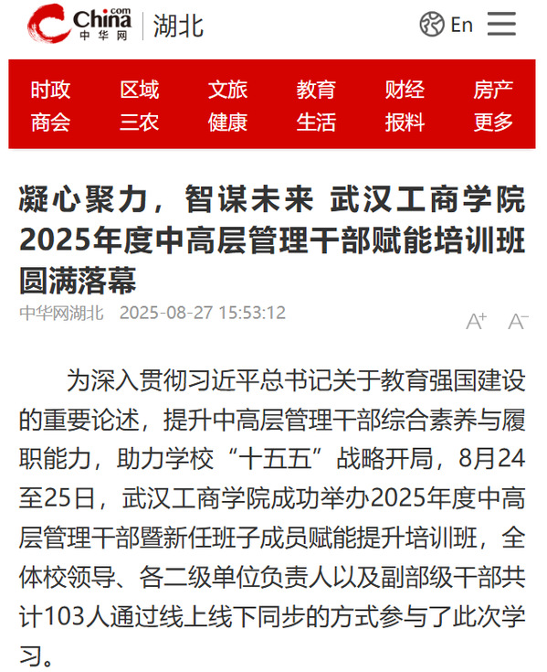 为深入贯彻习近平总书记关于教育强国建设的重要论述,提升中高层管理干部综合素养与履职能力,助力学校“十五五”战略开局,8月24至25日,武汉工商学院成功举办2025年度中高层管理干部暨新任班子成员赋能提升培训班,全体校领导、各二级单位负责人以及副部级干部共计103人通过线上线下同步的方式参与了此次学习。