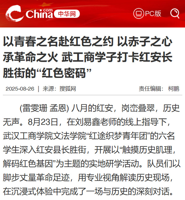 (雷雯珊 孟恩)八月的红安,岗峦叠翠,历史无声。8月23日,在刘易鑫老师的线上指导下,武汉工商学院文法学院“红途织梦青年团”的六名学生深入红安县长胜街,开展以“触摸历史肌理,解码红色基因”为主题的实地研学活动。队员们以脚步丈量革命足迹,用专业视角解读历史现场,在沉浸式体验中完成了一场与历史的深刻对话。