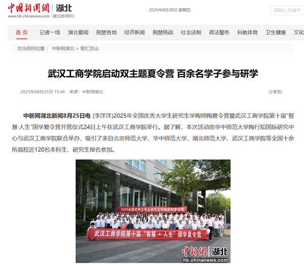 中新网湖北新闻8月25日电(李洋洋)2025年全国优秀大学生研究生学陶师陶夏令营暨武汉工商学院第十届“智慧·人生”国学夏令营开营仪式24日上午在武汉工商学院举行。据了解,本次活动由华中师范大学陶行知国际研究中心与武汉工商学院联合举办,吸引了来自北京师范大学、华中师范大学、湖北师范大学、武汉工商学院等全国十余所高校近120名本科生、研究生报名参加。