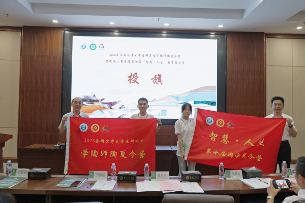 图为周洪宇教授(左一)、詹河焰书记(右一)为夏令营营员代表夏长璐(左二)、王莹(右二)授旗 摄影:芮雨欣