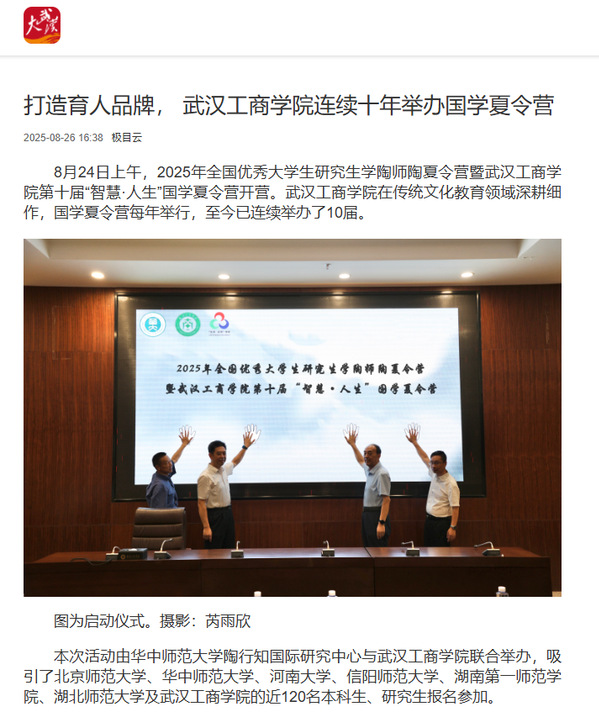 8月24日上午,2025年全国优秀大学生研究生学陶师陶夏令营暨武汉工商学院第十届“智慧·人生”国学夏令营开营。武汉工商学院在传统文化教育领域深耕细作,国学夏令营每年举行,至今已连续举办了10届。