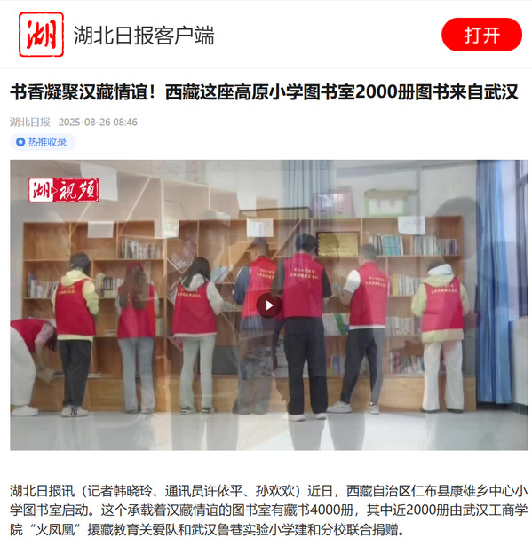 湖北日报讯(记者韩晓玲、通讯员许依平、孙欢欢)近日,西藏自治区仁布县康雄乡中心小学图书室启动。这个承载着汉藏情谊的图书室有藏书4000册,其中近2000册由武汉工商学院“火凤凰”援藏教育关爱队和武汉鲁巷实验小学建和分校联合捐赠。