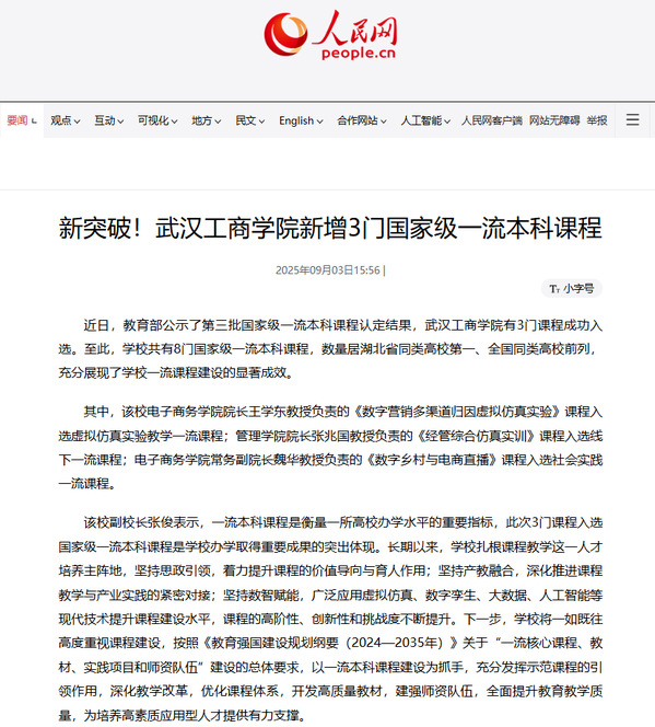 近日,教育部公示了第三批国家级一流本科课程认定结果,武汉工商学院有3门课程成功入选。至此,学校共有8门国家级一流本科课程,数量居湖北省同类高校第一、全国同类高校前列,充分展现了学校一流课程建设的显著成效。