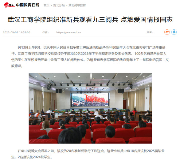 9月3日上午9时,纪念中国人民抗日战争暨世界反法西斯战争胜利80周年大会在北京天安门广场隆重举行,武汉工商学院组织学校党员领导干部和20名2025年下半年预定新兵及家长代表、100多名有意向参军入伍的学生在学校报告厅集中收看了盛大的阅兵仪式,为这些有志参军报国的热血青年上了一堂深刻的爱国主义教育课。