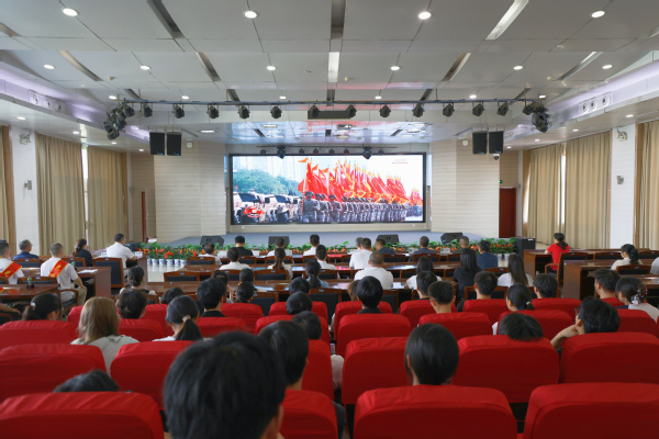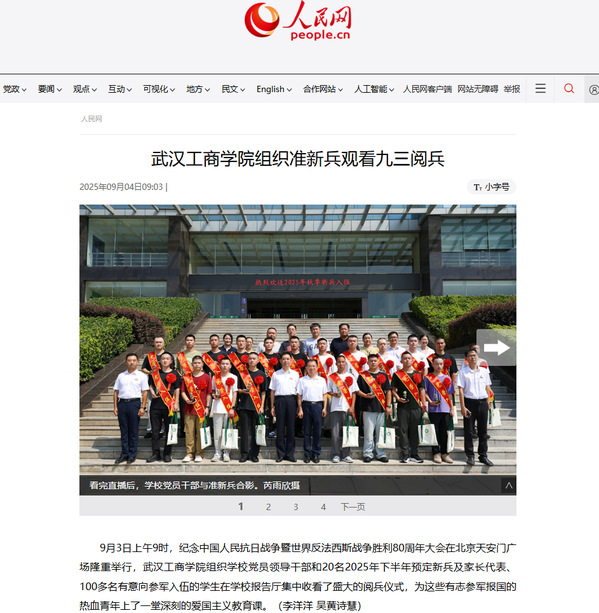 9月3日上午9时,纪念中国人民抗日战争暨世界反法西斯战争胜利80周年大会在北京天安门广场隆重举行,武汉工商学院组织学校党员领导干部和20名2025年下半年预定新兵及家长代表、100多名有意向参军入伍的学生在学校报告厅集中收看了盛大的阅兵仪式,为这些有志参军报国的热血青年上了一堂深刻的爱国主义教育课。(李洋洋 吴黄诗慧)