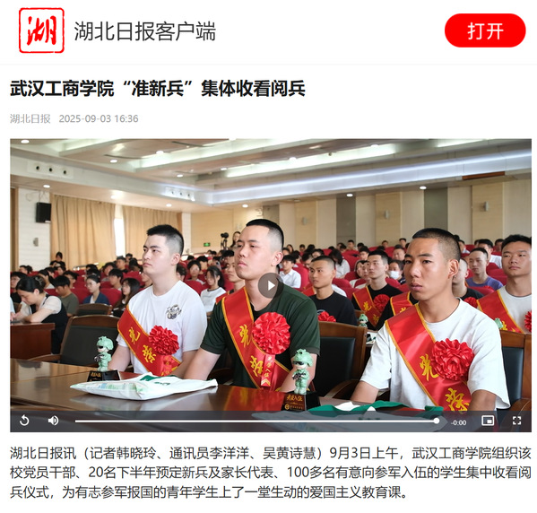 湖北日报讯(记者韩晓玲、通讯员李洋洋、吴黄诗慧)9月3日上午,武汉工商学院组织该校党员干部、20名下半年预定新兵及家长代表、100多名有意向参军入伍的学生集中收看阅兵仪式,为有志参军报国的青年学生上了一堂生动的爱国主义教育课。