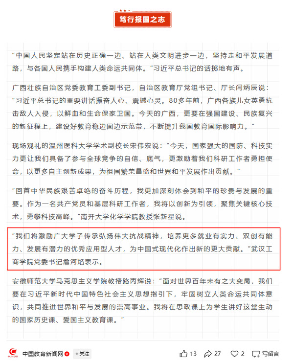 习近平总书记的重要讲话在全国教育系统引发热烈反响。广大师生纷纷表示,要铭记历史、缅怀先烈、珍爱和平、开创未来,让伟大抗战精神在新时代永放光芒。