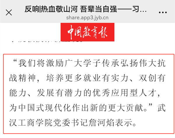 “我们将激励广大学子传承弘扬伟大抗战精神,培养更多就业有实力、双创有能力、发展有潜力的优秀应用型人才,为中国式现代化作出新的更大贡献。”武汉工商学院党委书记詹河焰表示。