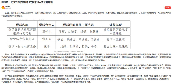 近日,教育部公示了第三批国家级一流本科课程认定结果,武汉工商学院有3门课程成功入选。至此,学校共有8门国家级一流本科课程,数量居湖北省同类高校第一、全国同类高校前列,充分展现了学校一流课程建设的显著成效。