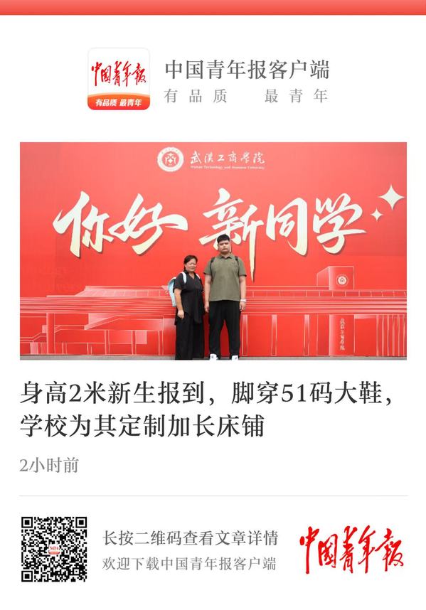 “好高啊!”......9月6日中午,武汉工商学院迎新报到现场迎来了一位身高2米的新生,吸引了不少人关注。