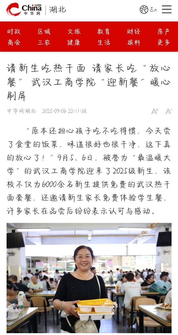 “原本还担心孩子吃不吃得惯,今天尝了食堂的饭菜,味道很好也很干净,这下真的放心了!”9月5、6日,被誉为“最温暖大学”的武汉工商学院迎来了2025级新生,该校不仅为6000余名新生提供免费的武汉热干面套餐,还邀请新生家长免费体验学生餐,许多家长在品尝后纷纷表示认可与感动。