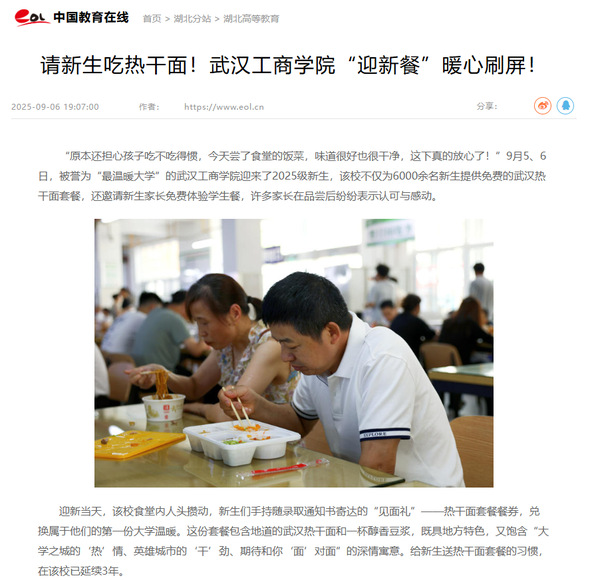 迎新当天,该校食堂内人头攒动,新生们手持随录取通知书寄达的“见面礼”——热干面套餐餐券,兑换属于他们的第一份大学温暖。这份套餐包含地道的武汉热干面和一杯醇香豆浆,既具地方特色,又饱含“大学之城的‘热’情、英雄城市的‘干’劲、期待和你‘面’对面”的深情寓意。给新生送热干面套餐的习惯,在该校已延续3年。