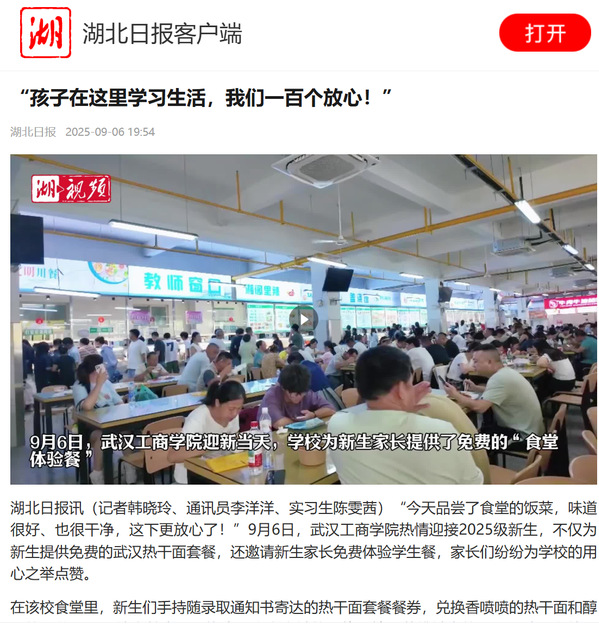 湖北日报讯(记者韩晓玲、通讯员李洋洋、实习生陈雯茜)“今天品尝了食堂的饭菜,味道很好、也很干净,这下更放心了!”9月6日,武汉工商学院热情迎接2025级新生,不仅为新生提供免费的武汉热干面套餐,还邀请新生家长免费体验学生餐,家长们纷纷为学校的用心之举点赞。