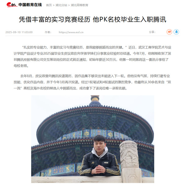 “扎实的专业能力、丰富的实习与竞赛经历,是我能够脱颖而出的关键。”近日,武汉工商学院艺术与设计学院产品设计专业2025届毕业生皮议政在向学弟学妹们分享就业经验时总结道。今年7月,他刚刚收到了深圳腾讯控股有限公司交互策划岗位的正式转正通知,初始年薪近30万元,他第一时间就将这一喜讯分享给了母校老师。
