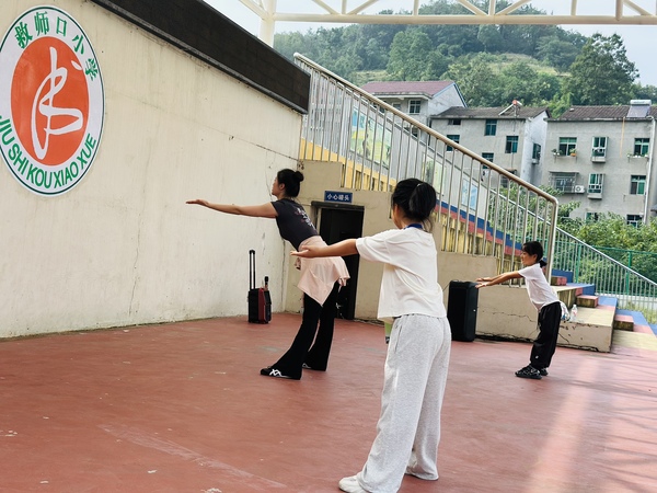 新闻中心讯(特约记者 陈莉)9月11、12日,武汉工商学院艺术与设计学院“开明美育”支教团队在民进湖北省委会组织下,赴湖北省宜昌市长阳土家族自治县磨市镇救师口小学开展首次美育支教活动,该团队由舞蹈表演系主任朱宇光、教师陈莉雯及2023级学生柏敏、方薇薇组成,以“非遗传承+美育浸润”为主线,通过舞蹈教学、互动游戏和文化交流等形式,为300余名学生带去生动的艺术启蒙。