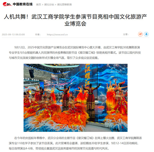 在今年的央视蛇年春晚中,武汉分会场的主题节目《星汉耀江城》在网上爆火出圈,武汉工商学院舞蹈表演专业110名学子参加了该节目表演。此次受博览会邀请,该校精选30名学生参演,9月12-14日活动期间,每日连续演出4-6场,带领观众重温武汉这座英雄城市的深厚文化底蕴与时代风采。