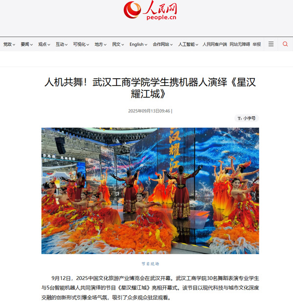 9月12日,2025中国文化旅游产业博览会在武汉开幕。武汉工商学院30名舞蹈表演专业学生与5台智能机器人共同演绎的节目《星汉耀江城》亮相开幕式。该节目以现代科技与城市文化深度交融的创新形式引爆全场气氛,吸引了众多观众驻足观看。