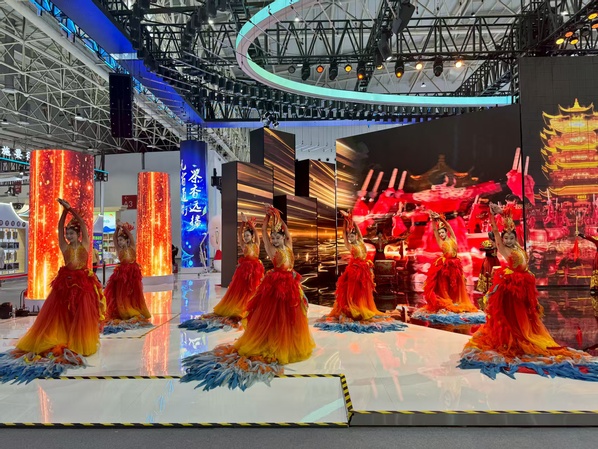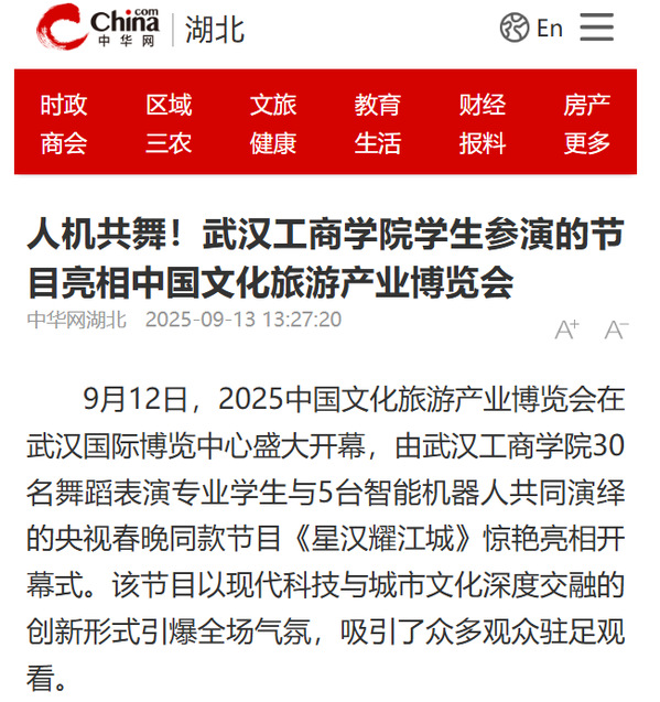 9月12日,2025中国文化旅游产业博览会在武汉国际博览中心盛大开幕,由武汉工商学院30名舞蹈表演专业学生与5台智能机器人共同演绎的央视春晚同款节目《星汉耀江城》惊艳亮相开幕式。该节目以现代科技与城市文化深度交融的创新形式引爆全场气氛,吸引了众多观众驻足观看。