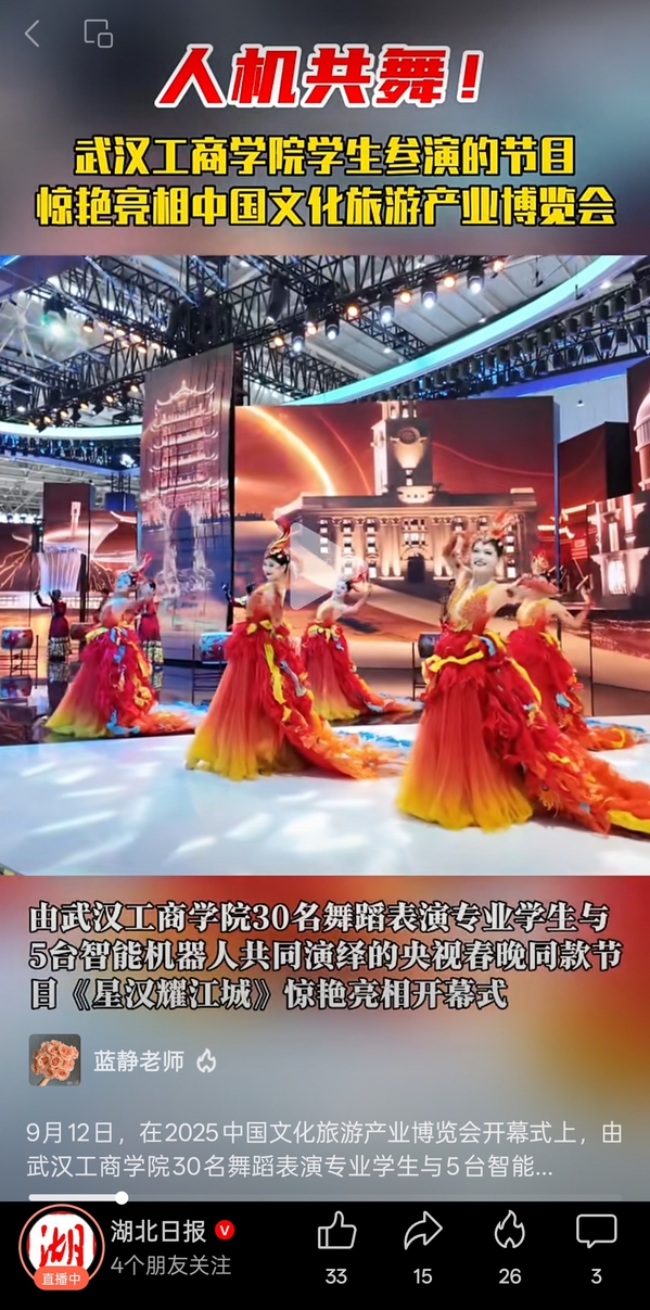 9月12日,在2025中国文化旅游产业博览会开幕式上,由武汉工商学院30名舞蹈表演专业学生与5台智能机器人共同演绎的央视春晚同款节目“凤凰舞”惊艳亮相。(记者:韩晓玲 通讯员:李萌 编发:辛乐)