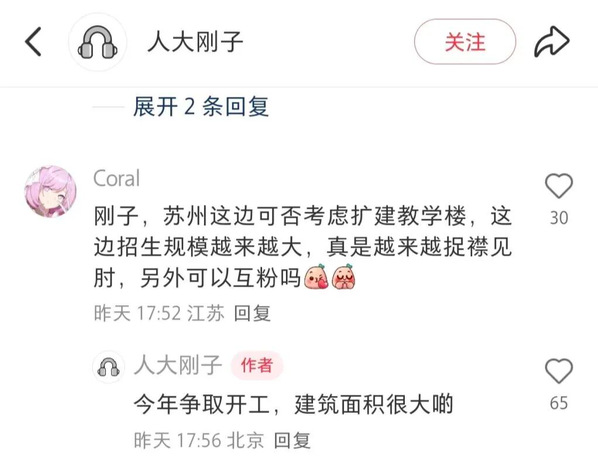 据报道,“人大刚子”的评论区已变成“许愿池”。通州校区与中关村校区班车过早结束、建议苏州校区扩建教学楼、建议通州校区食堂增设面点和新鲜水果……面对学生提出的花式问题和建议,“人大刚子”直接在社交平台作出“马上研究,尽快优化,照顾好自己的学生”等答复。