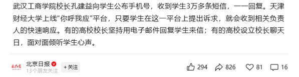 武汉工商学院校长孔建益向学生公布手机号,收到学生3万多条短信,一一回复。天津财经大学上线“你呼我应”平台,只要学生在这一平台上提出诉求,就会收到相关负责人的快速响应。有的高校校长坚持用电子邮件回复学生来信;有的高校设立校长聊天日,面对面倾听学生心声。