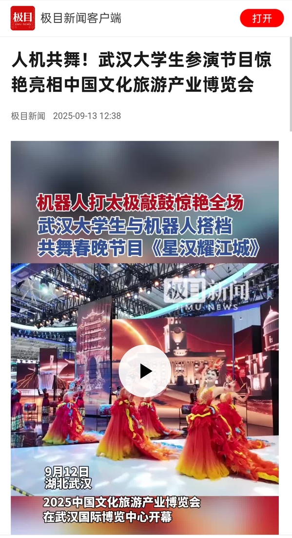 9月12日,2025中国文化旅游产业博览会在武汉国际博览中心盛大开幕,由武汉工商学院30名舞蹈表演专业学生与5台智能机器人共同演绎的央视春晚同款节目《星汉耀江城》惊艳亮相开幕式。该节目以现代科技与城市文化深度融合的创新形式引爆全场气氛,吸引了众多观众驻足观看。