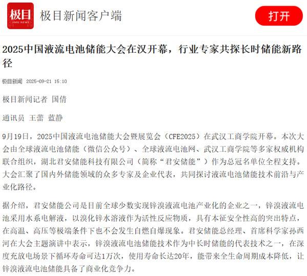 9月19日,2025中国液流电池储能大会暨展览会(CFE2025)在武汉工商学院开幕。本次大会由全球液流电池储能(微信公众号)、全球液流电池网、武汉工商学院等多家权威机构联合组织,湖北君安储能科技有限公司(简称“君安储能”)作为总冠名单位全程支持。大会汇聚了国内外储能领域的众多专家及企业代表,共同探讨液流电池储能技术前沿与产业化路径。