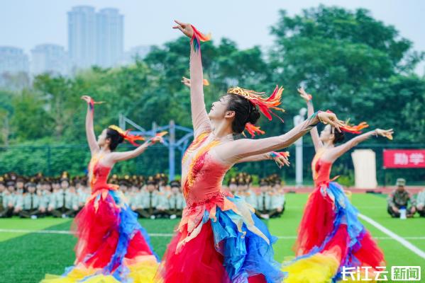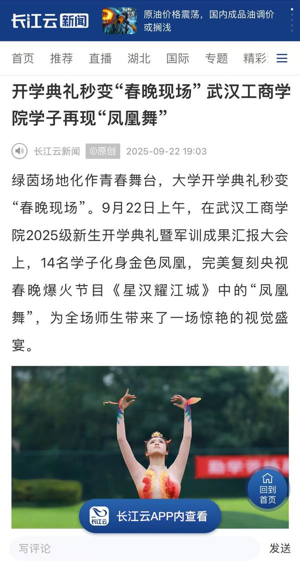 据悉,在今年的央视蛇年春晚中,武汉分会场的主题节目《星汉耀江城》在网上爆火出圈,武汉工商学院舞蹈表演专业110名学子参加了该节目表演,此次该校选拔了14名学生在新生开学典礼上表演。这场跨越荧屏与校园的视觉盛宴,不仅展现了该校美育教育的丰硕成果,更以凤凰涅槃的美好寓意,祝愿2025级新生在大学这个新起点上展翅高飞,书写人生华彩篇章。