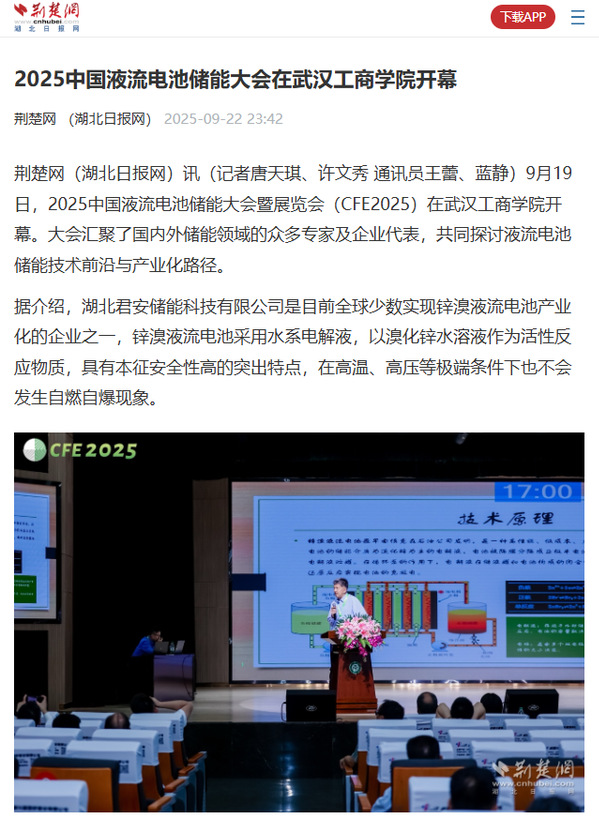 荆楚网(湖北日报网)讯(记者唐天琪、许文秀 通讯员王蕾、蓝静)9月19日,2025中国液流电池储能大会暨展览会(CFE2025)在武汉工商学院开幕。大会汇聚了国内外储能领域的众多专家及企业代表,共同探讨液流电池储能技术前沿与产业化路径。
