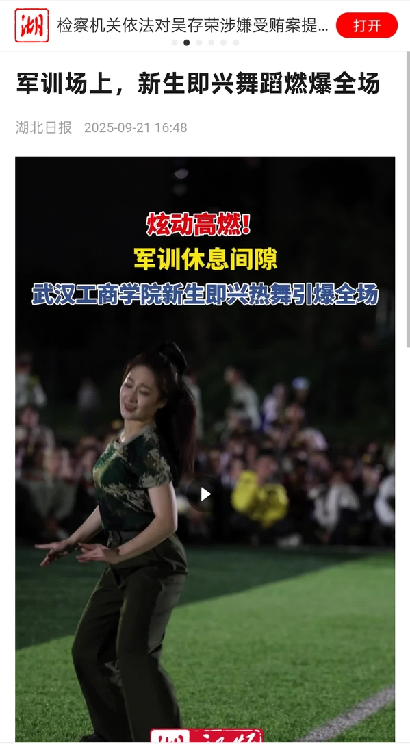 9月19日晚,武汉工商学院军训场上掌声雷动、欢呼不断。该校舞蹈表演专业的5名大一新生,在军训休息间隙即兴登场,带来了一场舞蹈“串烧”——蒙古舞、爵士、Hiphop、彝族舞等轮番上阵,瞬间点燃全场。学生们纷纷举起手机记录精彩时刻,不少人还跟随节奏摇摆,操场上成为一片青春与热情的海洋。