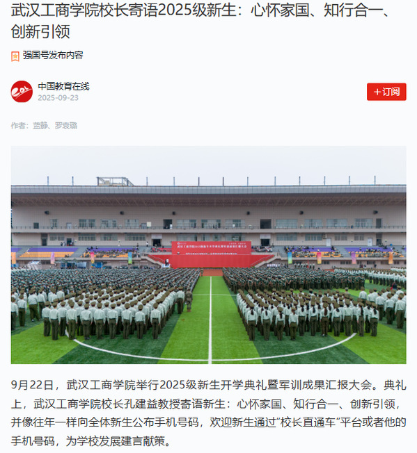 9月22日,武汉工商学院举行2025级新生开学典礼暨军训成果汇报大会。典礼上,武汉工商学院校长孔建益教授寄语新生:心怀家国、知行合一、创新引领,并像往年一样向全体新生公布手机号码,欢迎新生通过“校长直通车”平台或者他的手机号码,为学校发展建言献策。