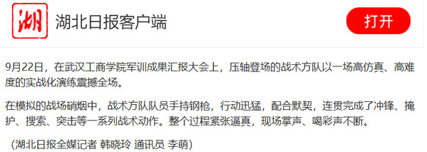 9月22日,在武汉工商学院军训成果汇报大会上,压轴登场的战术方队以一场高仿真、高难度的实战化演练震撼全场。