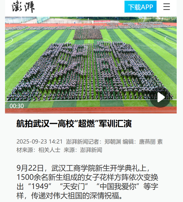 9月22日,武汉工商学院新生开学典礼上,1500余名新生组成的女子花样方阵依次变换出“1949”“天安门”“中国我爱你”等字样,传递对伟大祖国的深情祝福。