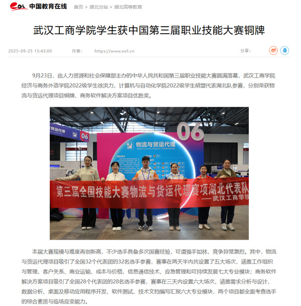 9月23日,由人力资源和社会保障部主办的中华人民共和国第三届职业技能大赛圆满落幕,武汉工商学院经济与商务外语学院2022级学生徐洪力、计算机与自动化学院2022级学生胡盟代表湖北队参赛,分别荣获物流与货运代理项目铜牌、商务软件解决方案项目优胜奖。