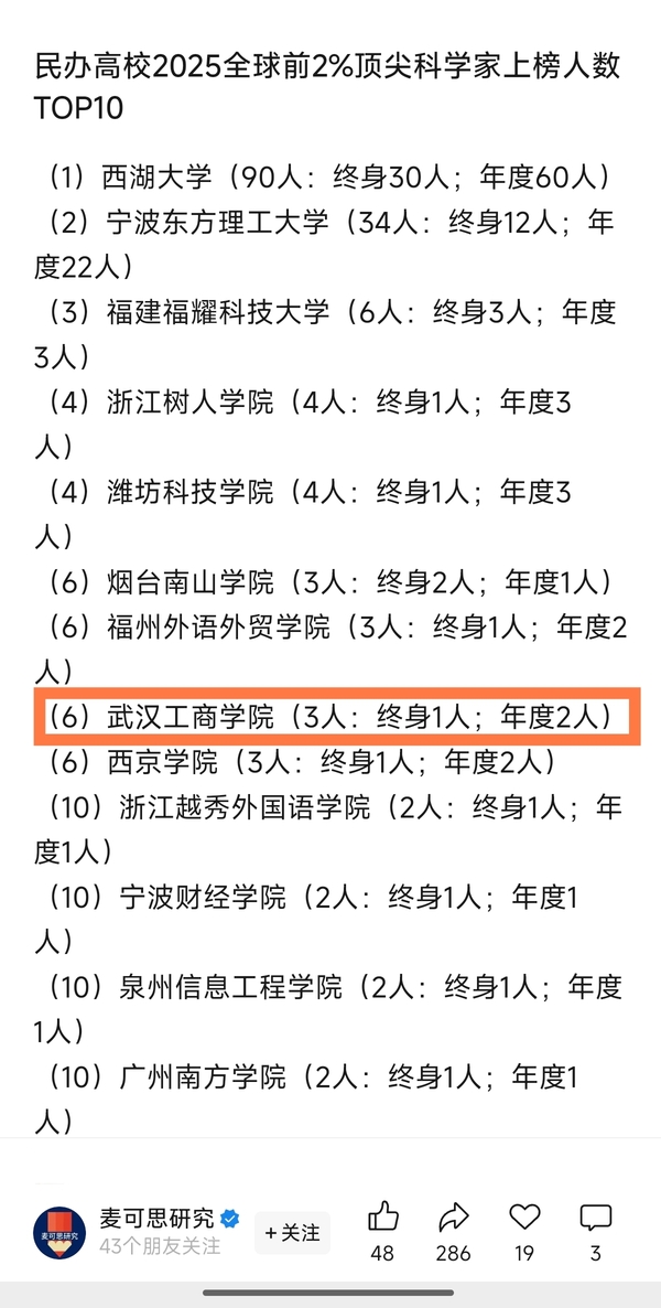 新闻中心讯(记者 万风)9月19日,斯坦福大学与国际权威学术出版社爱思唯尔共同发布2025年度“全球前2%顶尖科学家”榜单(World's Top 2% Scientists)。该榜单分为“终身科学影响力排行榜”和“年度科学影响力排行榜”两大部分。武汉工商学院1名学者入选“终身科学影响力榜单”,2名学者入选“年度科学影响力榜单”,入选学者总数位列湖北省同类高校首位,在全国同类高校中排名第六。