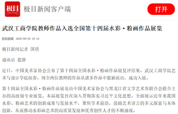 近日,中国美术家协会公布了第十四届全国水彩·粉画作品展复评结果。武汉工商学院艺术与设计学院侯春、周全两位教师的作品从诸多作品中脱颖而出,成功入展。