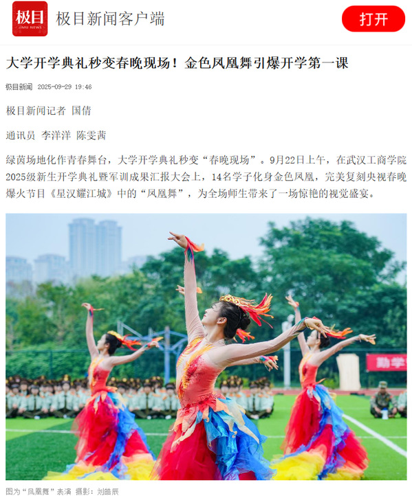 据悉,在今年的央视蛇年春晚中,武汉分会场的主题节目《星汉耀江城》在网上爆火出圈,武汉工商学院舞蹈表演专业110名学子参加了该节目表演,此次该校选拔了14名学生在新生开学典礼上表演。这场跨越荧屏与校园的视觉盛宴,不仅展现了该校美育教育的丰硕成果,更以凤凰涅槃的美好寓意,祝愿2025级新生在大学这个新起点上展翅高飞,书写人生华彩篇章。